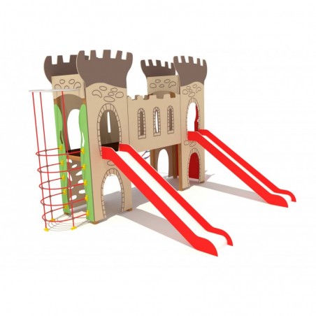 Structure ludique 2 tours au décor de château médiéval. On accède à la passerelle en grimpant le filet de grimpe vertical ou le filet incliné ou en utilisant le panneau perforé vertical. Les enfants peuvent ensuite descendre en utilisant. l’un des 2 toboggans ou le mât de pompier.