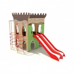 Grande tour au décor de château médiéval. On accède à la grande plateforme en escaladant l’un des 2 filets de grimpe verticaux. La descente peut se faire ensuite en utilisant l’un des 2 toboggans. ou l’un des 2 mâts de pompier.
