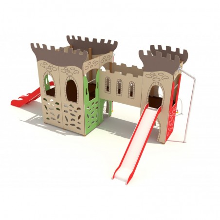 Grande tour au décor de château médiéval et sa tourelle. On accède à la plateforme en escaladant soit l’un des 2 filets de grimpe verticaux. soit l’échelle de corde. soit en utilisant les panneaux de grimpe perforés verticaux. Ensuite les enfants peuvent rejoindre la tourelle en empruntant la passerelle. La descente peut se faire ensuite en utilisant l’un des 3 toboggans. ou à l’aide du mât de pompier.