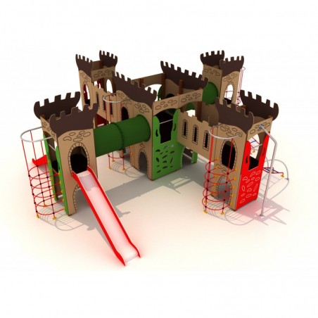 Très grande structure ludique 5 tours au décor de château médiéval. C’est la combinaison de 4 tourelles extérieures reliées à la grande tour centrale par des tunnels ou des passerelles. On accède à la plateforme en escaladant soit l’un des 4 filets de grimpe verticaux. soit l’une des 2 échelles de corde. soit en utilisant les panneaux de grimpe perforés verticaux. La descente peut se faire ensuite en utilisant l’un des 3 toboggans. ou à l’aide du mât de pompier.