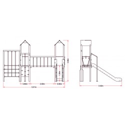 Ensemble composé de deux tours avec une structure porteuse en HRC, deux plateformes carrées, un panneau d'escalade en polyéthylène, une nouvelle échelle,
