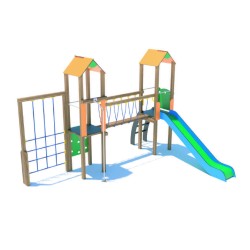 un toboggan de sortie, une passerelle entre les tours, une barre de pompiers et un filet d'escalade