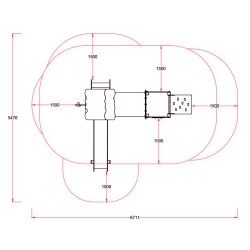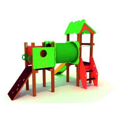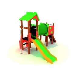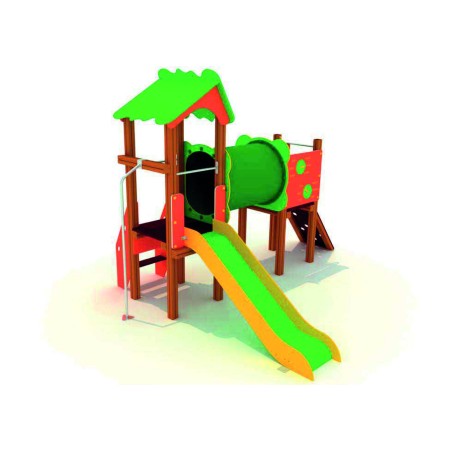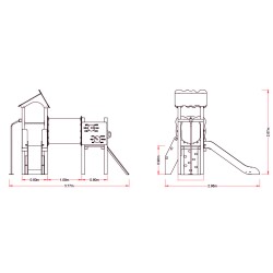 La structure dispose de deux tours, reliées par un tunnel, présente de multiples zones de jeu, toboggan, photocall, panneau ludique, escalade, échelle et barre de pompier.