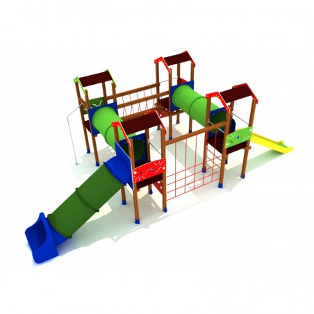 Passerelle 4 tours toitures 2 pans en “U” avec 2 toboggans. 3Trois accès de grimpe verticale : 1 échelle tubulaire ou 2 murs de grimpe. 2 tunnels parallèles relient 2 tourelles reliées par une passerelle fixe. La descente peut se faire par le mât de pompier ou utiliser l’un des 2 toboggans dont 1 tubulaire. 1 filet de grimpe vertical relie les deux tours toboggans.