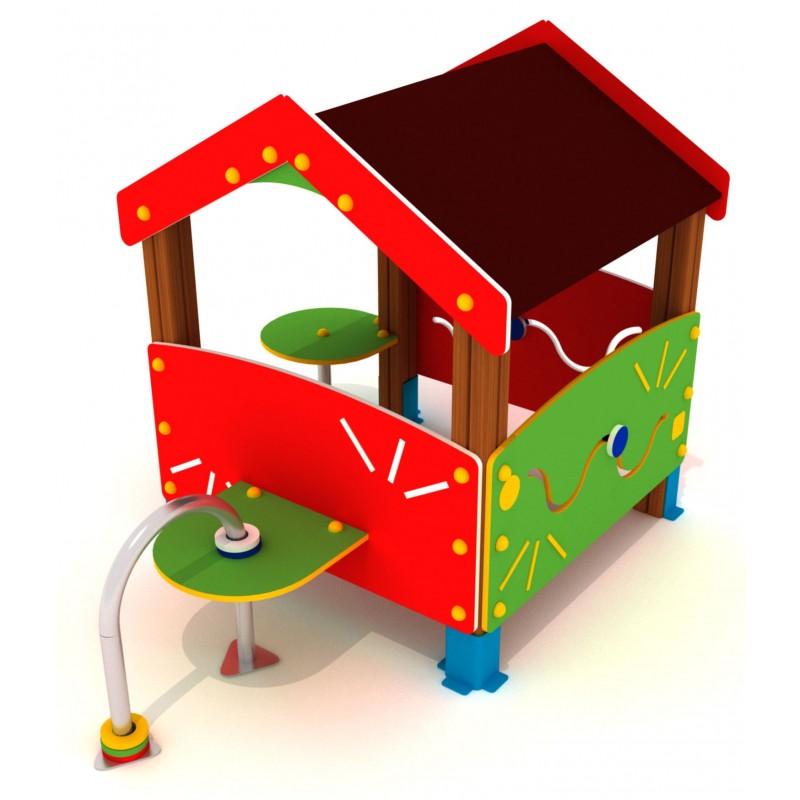 Petite structure toiture 2 pans très colorée pour le repos et les rencontres. Les enfants peuvent s’abriter sous le toit pour se raconter des histoires : 2 panneaux ludiques et 1 jeu avec des anneaux pour les distraire.