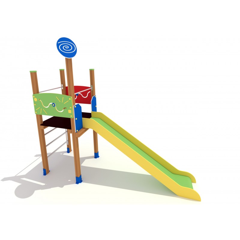 Petite tour et son toboggan. Une échelle tubulaire permet de grimper sur cette tour. 2 panneaux ludiques amuseront ceux qui attendent leur tour avant de descendre par le toboggan.