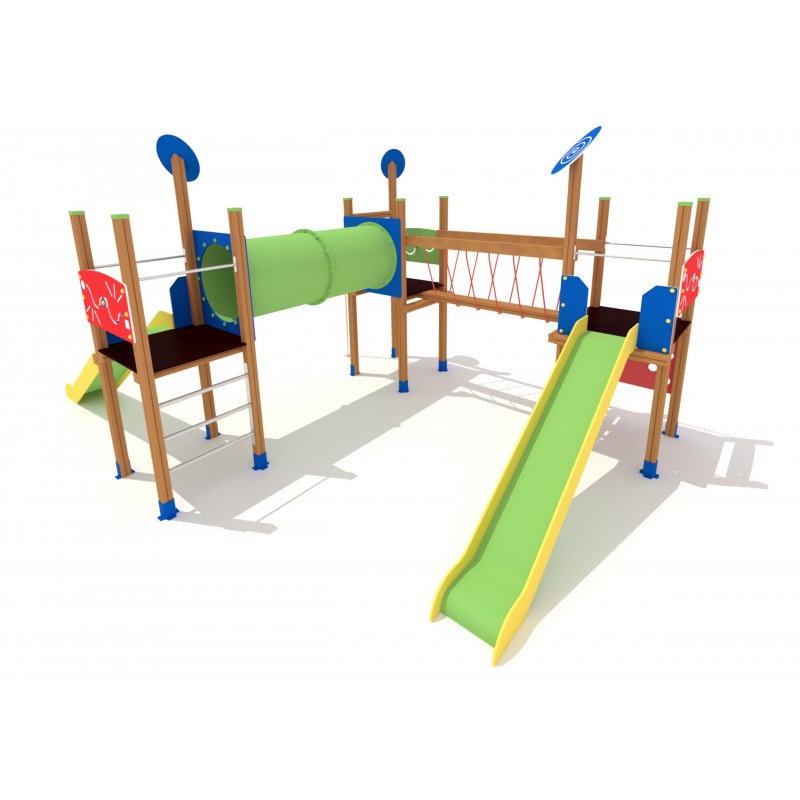 Passerelle 3 tours psychédéliques en “S”. Une combinaison de tourelles reliées par une passerelle fixe et un tunnel. L’accès se fait par un mur de grimpe ou une échelle tubulaire. 3 panneaux ludiques dans la zone d’attente avant la descente avec 2 toboggans.