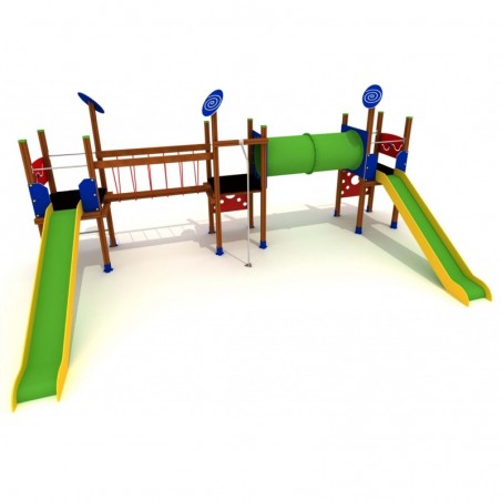 Passerelle 3 tours psychédéliques en “U”. Une combinaison de tourelles reliées par une passerelle fixe et un tunnel. L’accès se fait par un mur de grimpe ou une échelle tubulaire. 2 panneaux ludiques dans la zone d’attente avant la descente avec 2 toboggans.