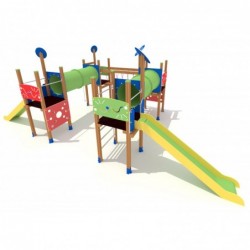 Passerelle 4 tours psychédéliques en “U” avec 2 toboggans. 3 accès de grimpe verticale : échelle tubulaire ou 2 murs de grimpe. Deux tunnels parallèles relient 2 tourelles reliées par une passerelle fixe. La descente peut se faire par le mât de pompier ou utiliser l’un des 2 toboggans.