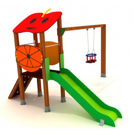 Petite tour très originale avec un pan incliné pour accéder à la plateforme et au toboggan. Cette structure dispose en plus d'une balançoire pour les petits enfants.