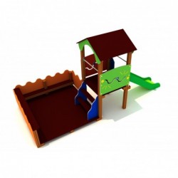 Petite maison et son patio où se trouvent des bancs. En prenant l’escalier. on accède à la plateforme de départ toboggan où 2 panneaux ludiques seront utiles pour attendre son tour.