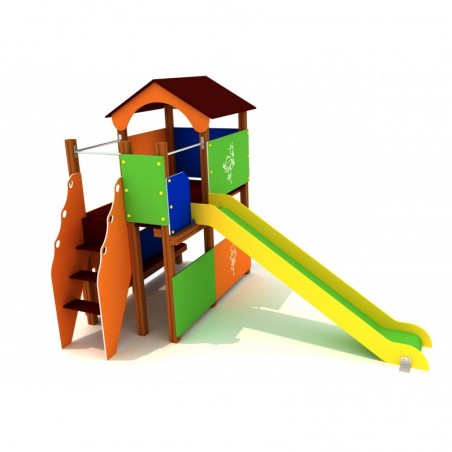 Petite maison à 2 étages. On accède à la plateforme en utilisant l’escalier pour redescendre par le toboggan