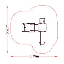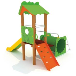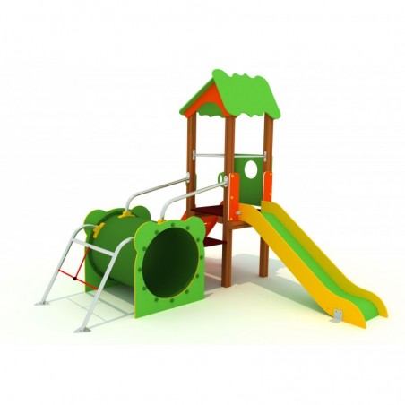 Petite tour et son tunnel au sol. Cette structure développe l’agilité en passant sur le tunnel en s’appuyant sur les rampes inox. Ceci permet d’accéder à la passerelle de la petite tour. accessible également par le pan incliné perforé. La descente s’effectue par le toboggan.