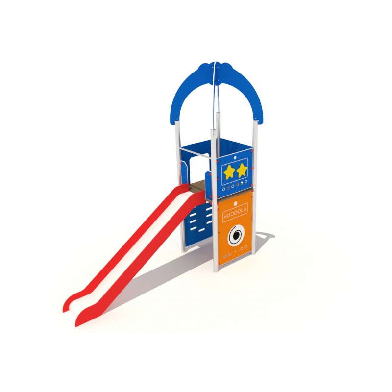 Petite tour cubique très compacte colorée et son toboggan. L'accès à la plateforme se fait par un panneau vertical perforé. Sous la plateforme se trouve un panneau ludique pour les petits.