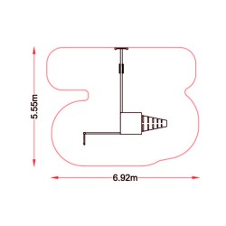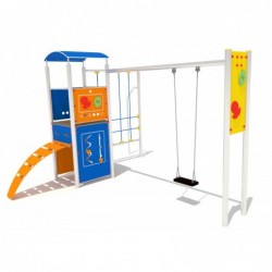 Grande tour cubique colorée et sa balançoire. L’accès à la tour se fait par un panneau galbé et perforé ou par le filet de grimpe vertical. à côté duquel se trouve un mât de pompier. Sur le côté. une grande balançoire pour le plaisir des plus grands.