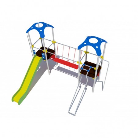 Structure ludique 2 tours reliées par une passerelle mobile. L'accès aux plateformes se fait par un panneau vertical perforé. La descente se fait soit par le toboggan classique. soit par la rampe de glisse tubulaire. soit à l’aide des 2 mâts de pompier.