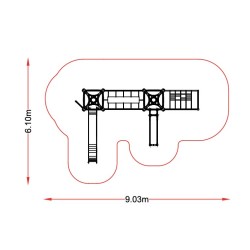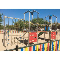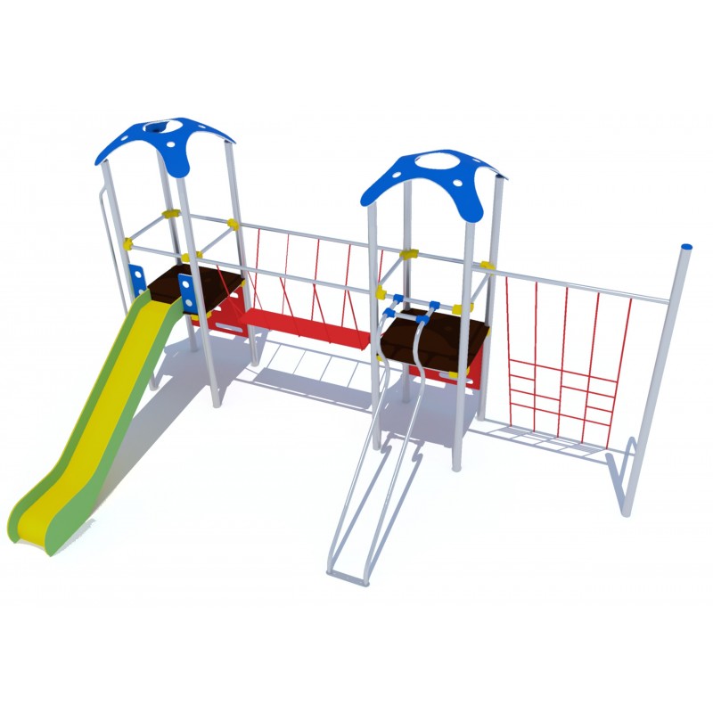 Structure ludique 2 tours reliées par une passerelle mobile. L'accès aux plateformes se fait par un panneau vertical perforé. ou à l’aide du filet de grimpe vertical incliné. La descente se fait soit par le toboggan classique. soit par la rampe de glisse tubulaire. soit à l’aide du mât de pompier.