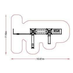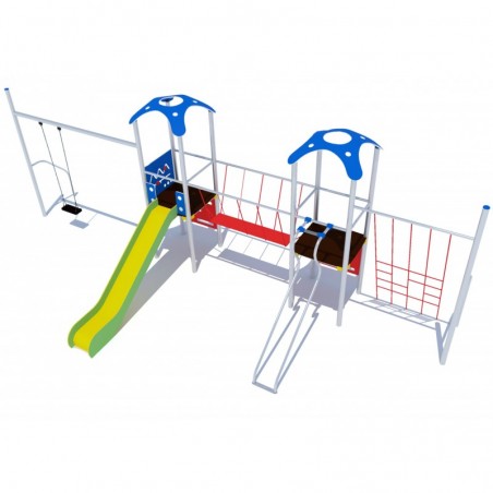 Grande structure ludique 2 tours reliées par une passerelle mobile. L'accès aux plateformes se fait par un panneau vertical perforé. ou à l’aide du filet de grimpe vertical incliné. La descente se fait soit par le toboggan classique. soit par la rampe de glisse tubulaire. Sur le côté. une grande balançoire pour le plaisir de tous.