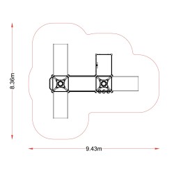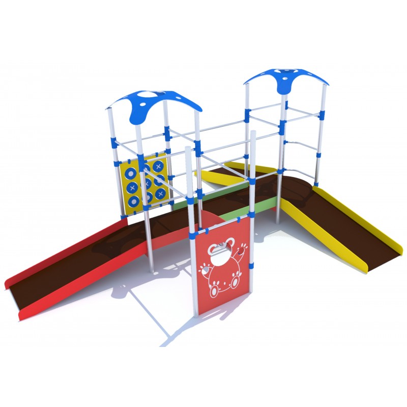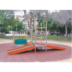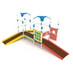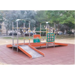 Complexe 2 tours avec structure métallique principale formée de 8 poteaux carrés et plancher, avec trois rampes d'accès et un pont pour fauteuil roulant, tous deux de 1200 mm. C'est large. Ces rampes ainsi que le pont permettent aux enfants en fauteuil roulant de s'intégrer dans le jeu, leur permettant de l'escalader et de circuler entre les mêmes jeux et les jeux suivants avec les panneaux interactifs. Un panneau est également incorporé pour l'ensemble 3 en ligne et une zone photocall, où l'enfant peut accéder à sa chaise et peut interagir, comme prendre des photos avec son visage.