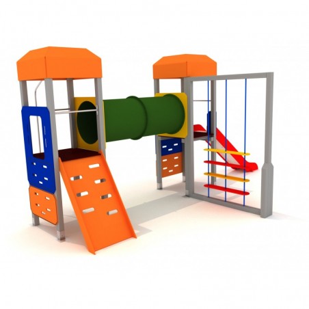 Structure ludique aux 2 grandes tours aux toits orange. La première tour est accessible par un grand pan incliné ou un mur vertical. Ensuite soit les enfants descendent par le mât de pompier. soit en passant dans le tunnel pour accéder à l’autre tour. Elle dispose d’un grand mur de grimpe et d’un filet de grimpe vertical. La descente peut se faire aussi en utilisant le toboggan.