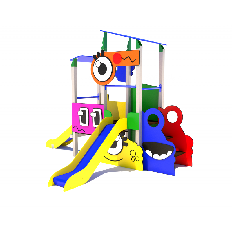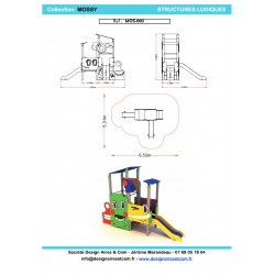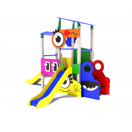 Double tour très rigolote avec ses deux toboggans accessibles par ses deux escaliers et une passerelle pour attendre son tour. Elle dispose d'un toit pour abriter les enfants.