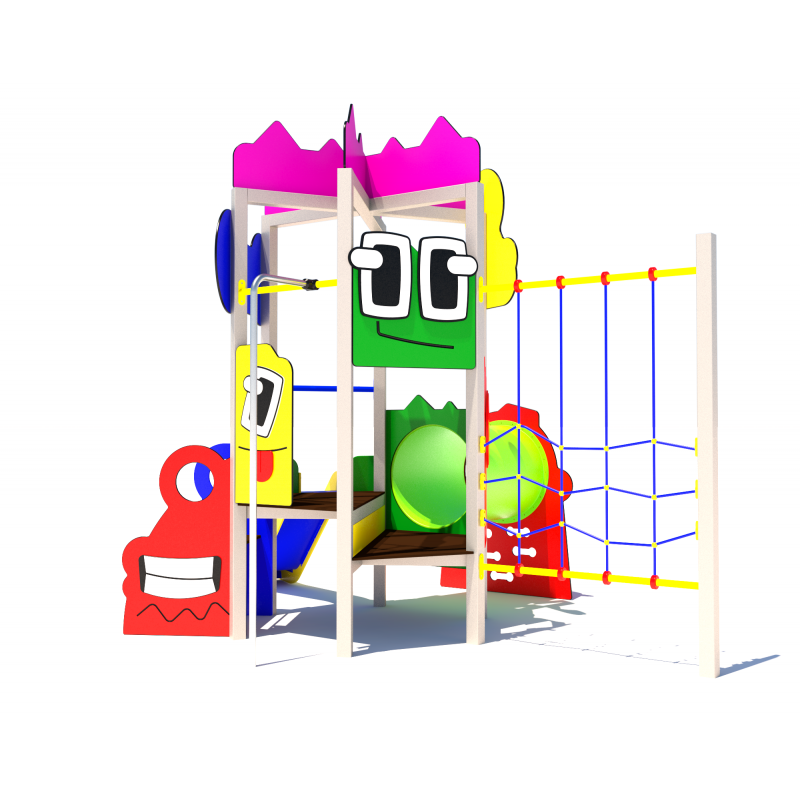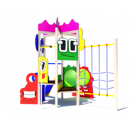 La grande tour Mossy avec ses 2 paliers. On peut y accéder soit par le tunnel et son échelle verticale. soit en utilisant l'escalier. soit par le cordage vertical. Les enfants pourront ensuite redescendre avec le mât de pompier ou alors utiliser le toboggan.