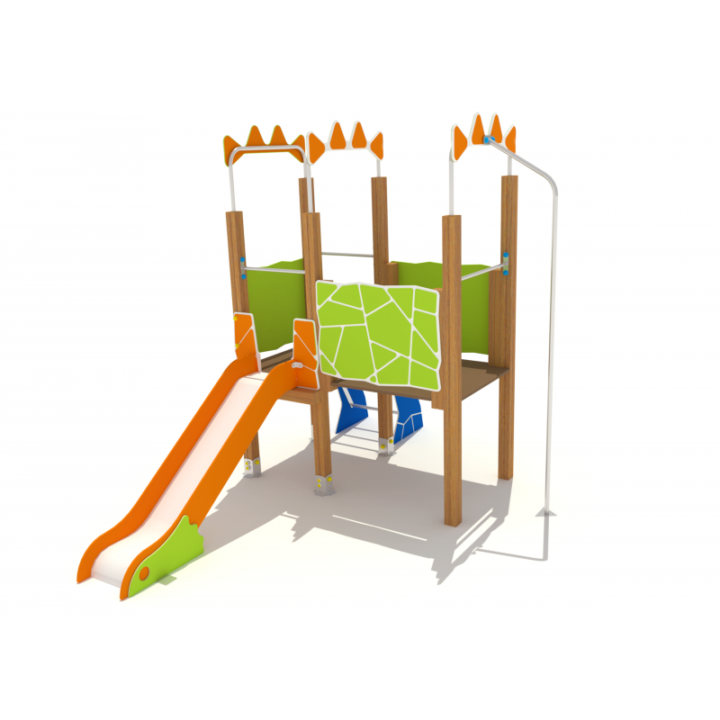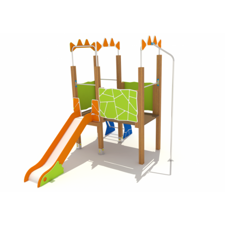 Petite tour belvédère aux décors originaux avec un escalier pour accéder à la plateforme et au toboggan. On peut également descendre en utilisant le mât de pompier.