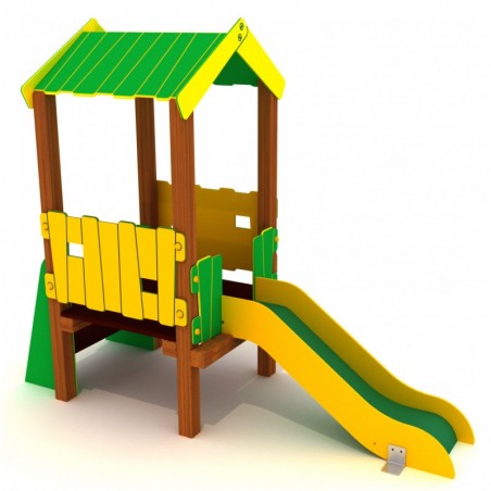Une petite maisonnette sur pilotis. On y accède par l’escalier et on descend à l’aide du toboggan.