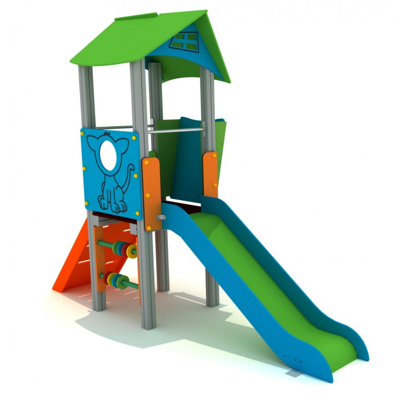 Petite tour avec une grande toiture aux 2 pans verts : un pan incliné permet de grimper sur cette tour. Au sol 2 barres de jeu avec des anneaux. Sur la plateforme un panneau passe tête amusera tout le monde avant de descendre par le toboggan.