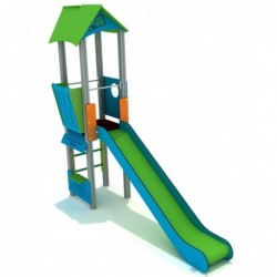 Grande tour avec une grande toiture aux 2 pans verts : une échelle tubulaire permet de grimper sur cette tour. Sur la plateforme un panneau passe tête amusera tout le monde avant de descendre par le toboggan. Sous la plateforme un comptoir de vente pour les plus petits.