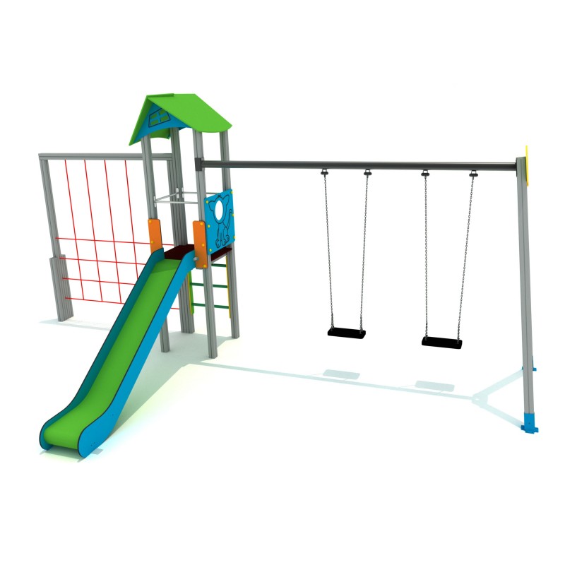 Grimper. glisser et se balancer : cette structure combine les plaisirs. Grande tour avec une grande toiture aux 2 pans verts avec son toboggan. Une échelle tubulaire permet de grimper sur cette tour. Un grand filet de grimpe vertical d’un côté et une double balançoire de l’autre pour se relaxer. Sur la plateforme un panneau passe tête amusera tout le monde avant de descendre par le toboggan.