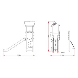 Un grande tour avec une toiture aux 2 pans avec son toboggan. L’accès à la plateforme peut se faire soit à l’aide de l’échelle tubulaire, soit par le pan incliné équipé de prises de grimpe qui donne accès au tunnel.