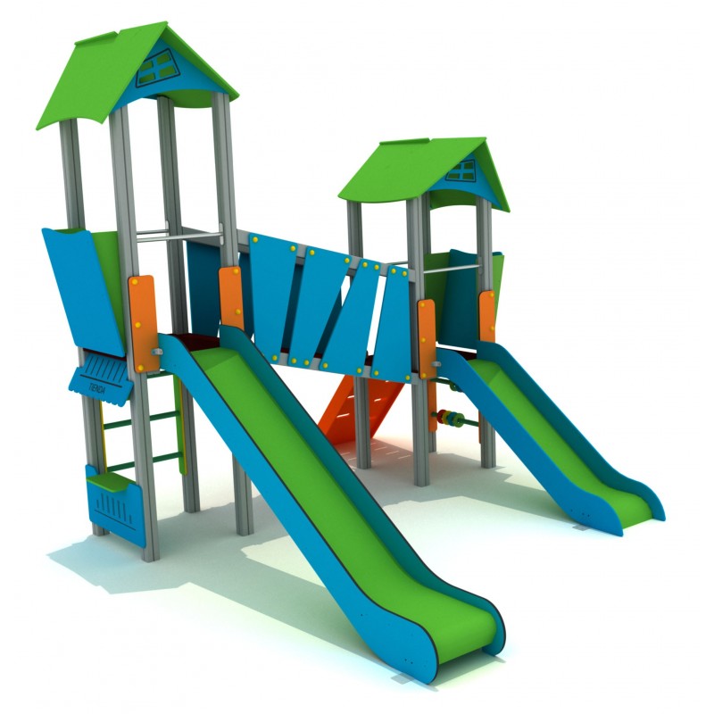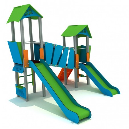 Structure ludique avec 2 tours à 2 niveaux et aux grandes toitures 2 pans verts. L’accès se fait par un pan incliné perforé ou par une échelle tubulaire. Sous la plus haute plateforme un comptoir de vente pour les plus petits et sous l’autre. 2 barres de jeu avec des anneaux. La liaison entre les deux tours se fait par une passerelle inclinée. Pour la descente. les enfants disposent de 2 toboggans.