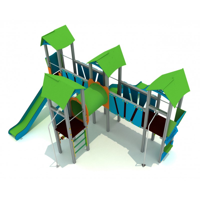 Grande passerelle de forme en croix à 4 tours et aux grandes toitures 2 pans verts. L’accès se fait par 3 échelles tubulaires. La grande passerelle en ligne donne accès aux 2 toboggans. au tunnel ou aux 2 barres de pompier. Sous une des grandes tours se trouve un comptoir de vente et sous une autre. le jeu des anneaux sur 2 barres pour les plus petits.
