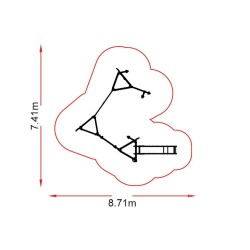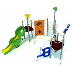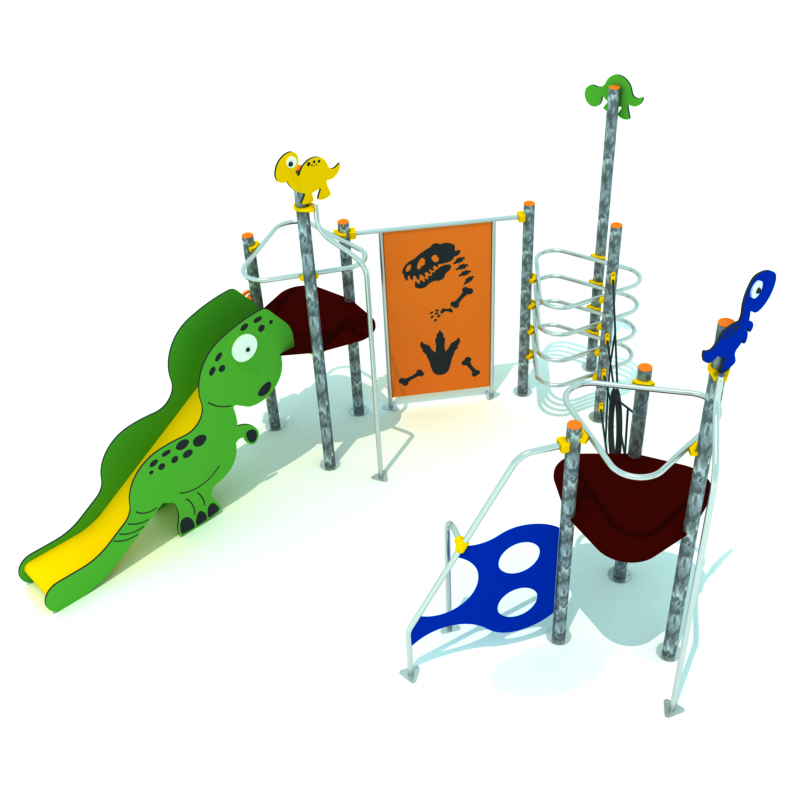 Grande structure ludique 3 tours Dino. Ensemble regroupant tous les modules de la collection. L’accès aux 2 plateformes se fait par un escalier en colimaçon le long d’un poteau. ou par la structure tubulaire et son panneau perforé. L’autre tour tubulaire permet de grimper et d’accéder au filet de grimpe. La descente peut se faire soit par le toboggan. soit à l’aide du mât de pompier. Au milieu un panneau au décor de squelette dinosaures pour le plus grand amusement des enfants.