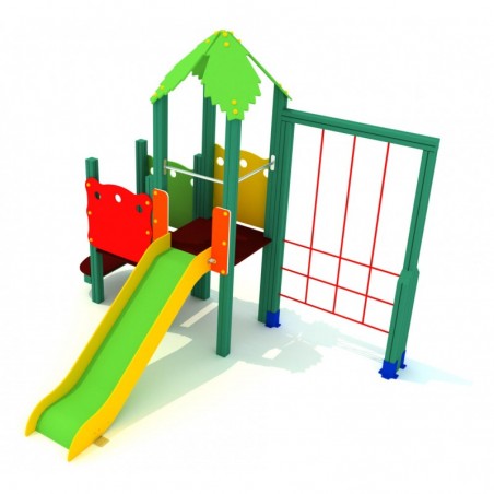 Structure de jeux extérieurs de la gamme JUNGLE: Une tour avec un toboggan, une tour pour y accéder et un filet de grimpe