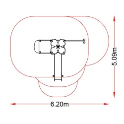 Petite tour avec toiture 4 pans feuilles. Une marche permet de monter sur la première plateforme qui donne accès à la seconde située dans la tour principale pour ensuite descendre par le toboggan. L’accès à cette tour peut également se faire par le filet vertical.