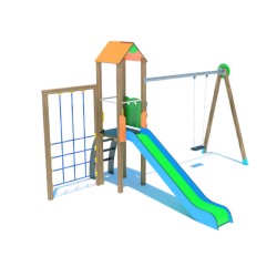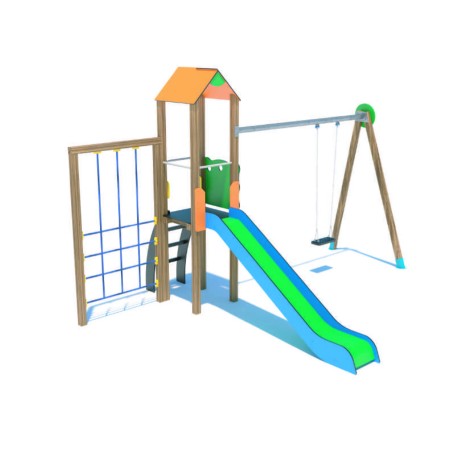 Structure de jeu avec une tour, un toboggan, une balançoire et un filet de grimpe