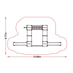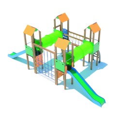 deux toboggans de sortie, une passerelle et de 2 tunnels entre les tours, une barre de pompier et un filet d'escalade