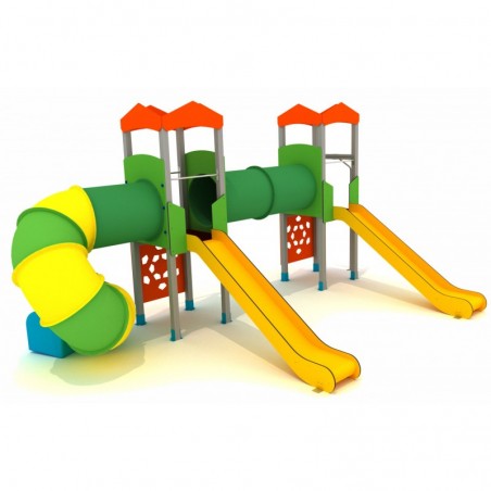 Une structure originale pour le plaisir des enfants : grimper. ramper. glisser. L’accès aux tours se fait par deux panneaux perforés verticaux. Pour la descente. les enfants ont le choix entre les 3 toboggans (2 toboggans ouverts et 1 toboggan tubulaire) ou utiliser le mât de pompier.