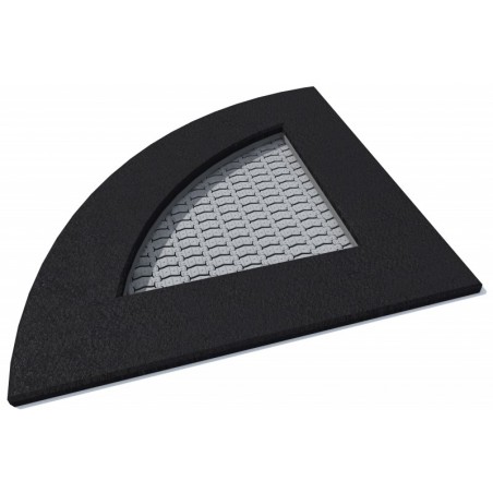 Trampoline de forme triangle ou quart de rond avec zone de saut destiné à être utilisé sur des aires de jeux à usage intensif. Le tapis de saut est fait de lamelles très résistantes d'une largeur de min. 37 mm, ayant la forme de la lettre "V" et renforcé par des nervures. Grâce à la forme unique des lamelles, les espaces entre les éléments de tapis ont été réduit à seulement 7 mm, ce qui empêche les petits objets, tels que les clés ou les téléphones portables, de tomber dans le trampoline. Le tapis est disponible en 8 coloris, il est également possible de faire des graphismes sur le tapis. La périphérie du trampoline est en SBR Rouge ou Noir en standard.