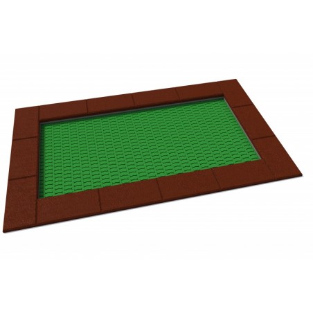Trampoline de forme rectangulaire destiné à être utilisé sur des aires de jeux à usage intensif. Le tapis de saut est fait de lamelles très résistantes d'une largeur de min. 37 mm, ayant la forme de la lettre "V" et renforcé par des nervures. Grâce à la forme unique des lamelles, les espaces entre les éléments de tapis ont été réduit à seulement 7 mm, ce qui empêche les petits objets, tels que les clés ou les téléphones portables, de tomber dans le trampoline. Le tapis est disponible en 8 coloris, il est également possible de faire des graphismes sur le tapis. La périphérie du trampoline est en SBR Rouge ou Noir en standard