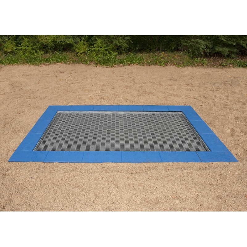Trampoline enterré dans le sol avec zone de sécurité tout autour.