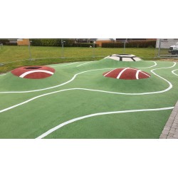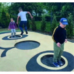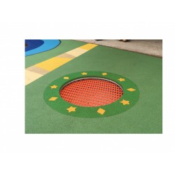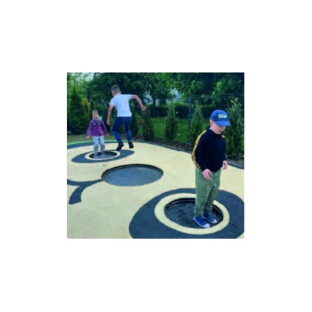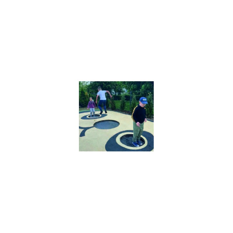 Trampoline de forme RONDE destiné à être utilisé sur des aires de jeux à usage intensif. Le tapis de saut est fait de lamelles très résistantes d'une largeur de min. 37 mm, ayant la forme de la lettre "V" et renforcé par des nervures. Grâce à la forme unique des lamelles, les espaces entre les éléments de tapis ont été réduit à seulement 7 mm, ce qui empêche les petits objets, tels que les clés ou les téléphones portables, de tomber dans le trampoline. Le tapis est disponible en 8 coloris, il est également possible de faire des graphismes sur le tapis. La périphérie du trampoline est en SBR Rouge ou Noir en standard